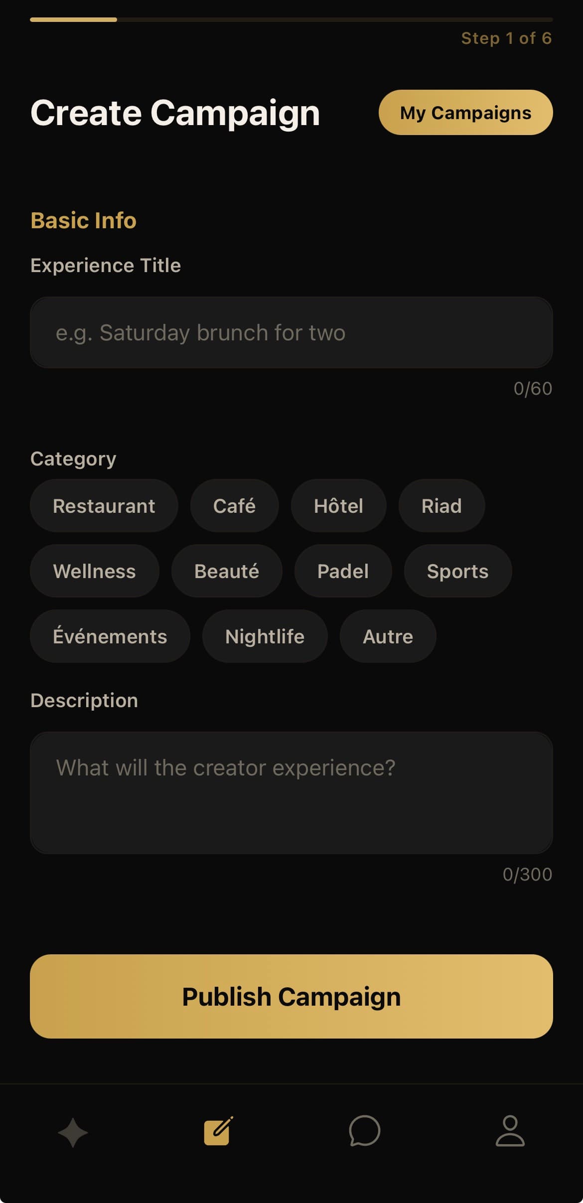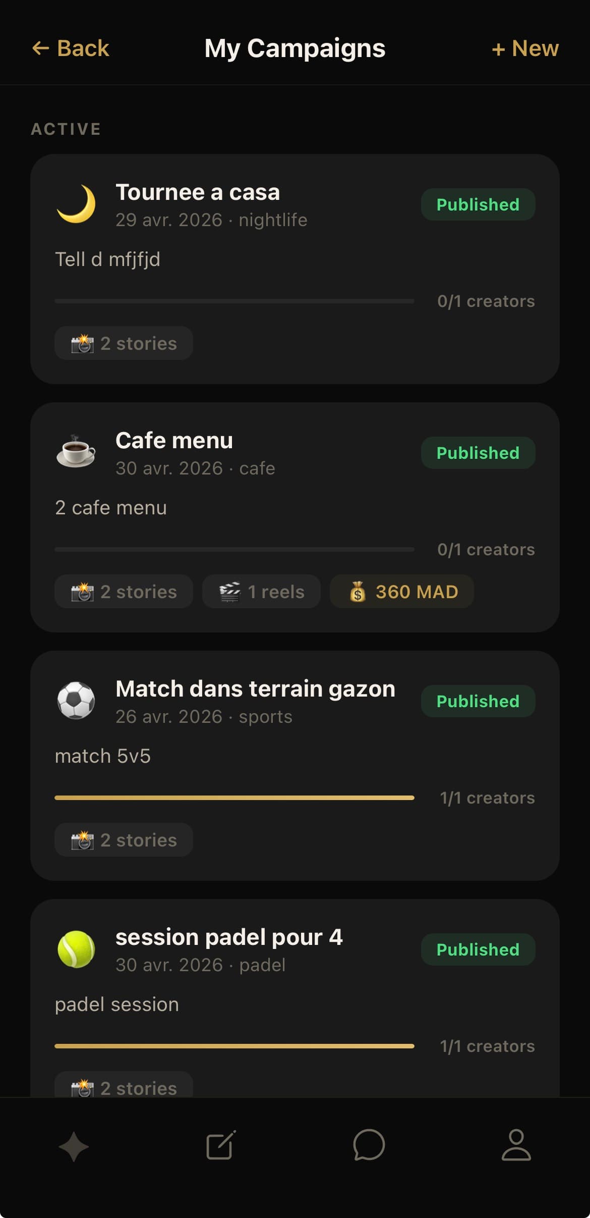 Suivez vos campagnes actives, les créateurs invités, les demandes reçues — tout centralisé, tout visible.